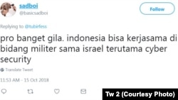 Pemilik akun @sadboi yang setuju jika hubungan diplomatik antara Indonesia dan Israel dibuka menyebut bahwa Indonesia bisa diuntungkan karena kerjasama “militer dan cyber security” dengan Israel.