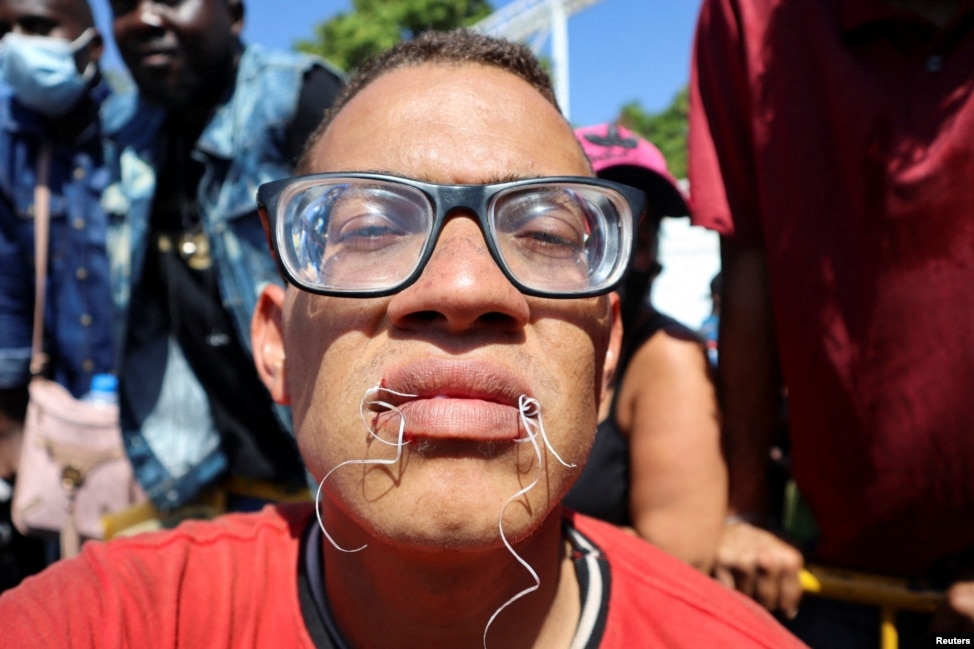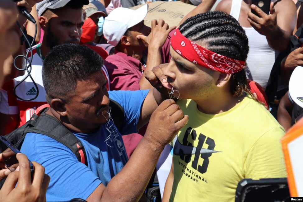 Beberapa migran terlihat membiarkan bibir atas dan bibir bawah mereka dijahit teman mereka dengan menggunakan jarum dan benang gigi (dental floss). Mereka yang mulutnya dijahit itu tidak hanya migran lelaki, namun juga perempuan.